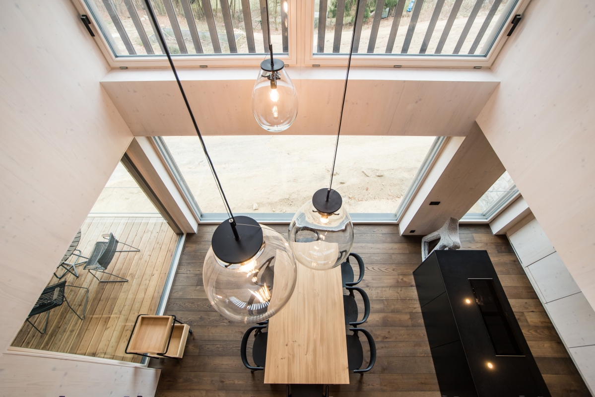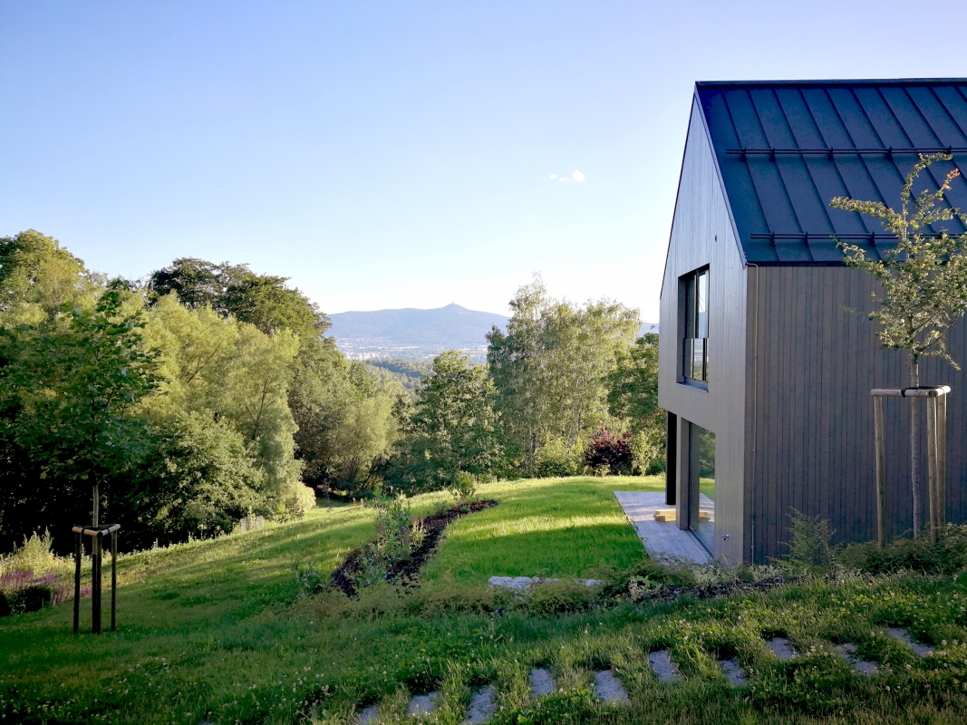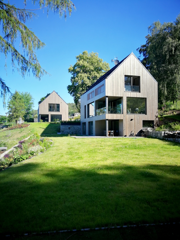 Near Liberec, in beautiful nature with beautiful views of the surrounding hills, two family houses, wooden buildings were designed. The placement of buildings in the sloping land proved to be essential for the whole project. Everything is tuned to ensure most of the space with views and full optical connection with beautiful scenery. The living room is therefore glazed around its perimeter.