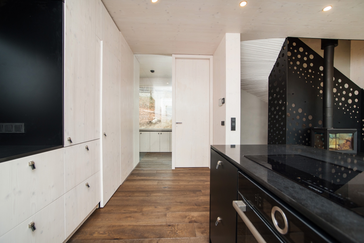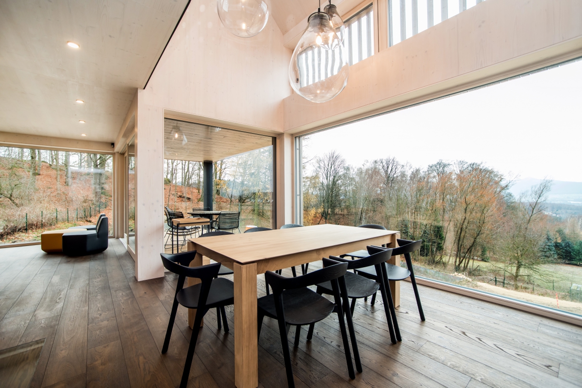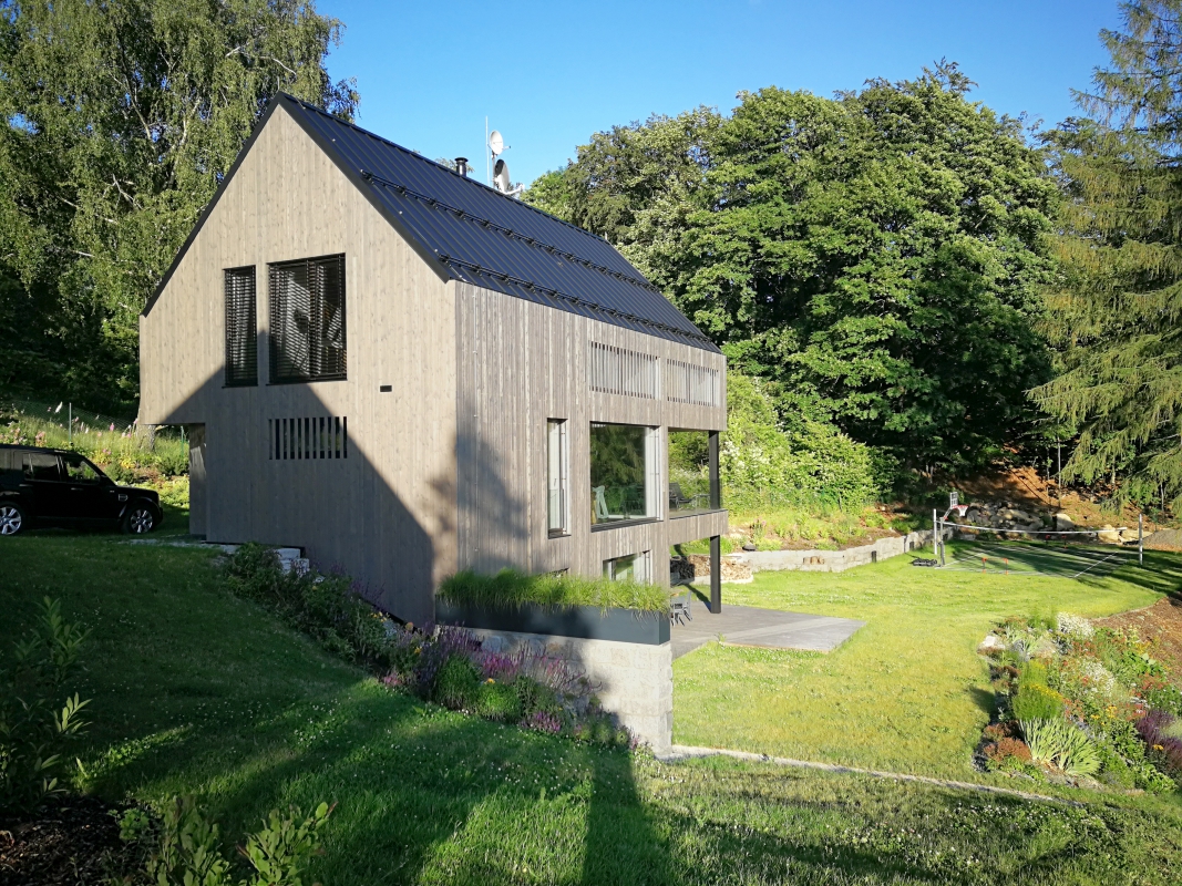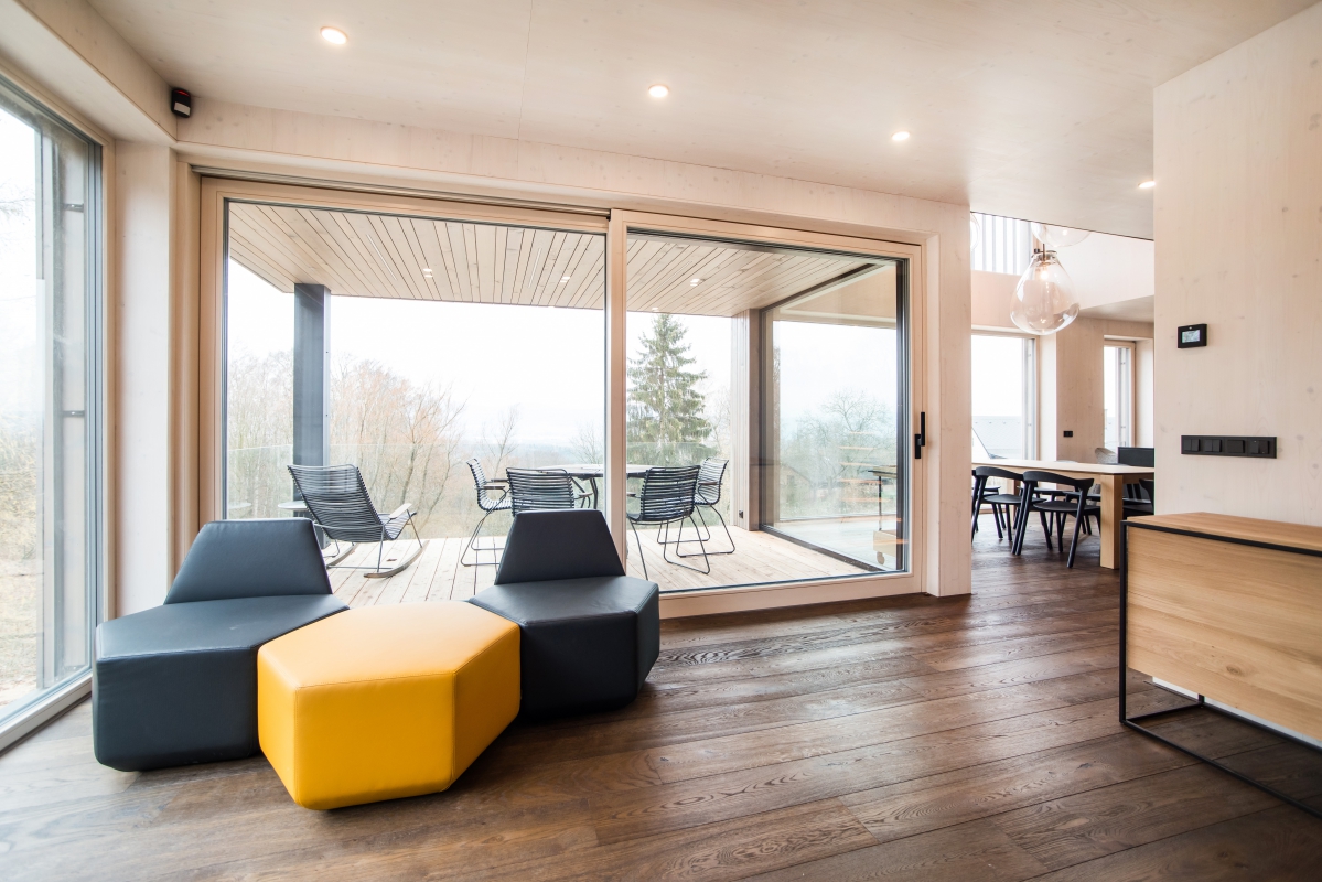 The roofing is sheet metal, folded. The facade is lined with vertically laid wooden slats. Wood also appears in the interior, both on floors and wall paneling. The construction of the 1st floor, including the ceiling, is designed from monolithic reinforced concrete. The superstructure is completely designed as a wooden column structure. The stair core passing through all floors is made of monolithic reinforced concrete and stabilizes the building.