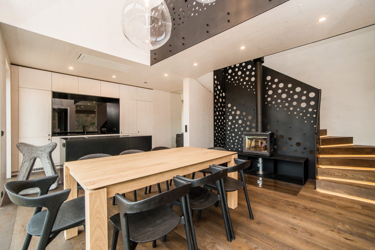 The interior is decorated in light natural shades with black accents. In the middle of the living area is a fireplace with a staircase and a sheet metal perforated railing.