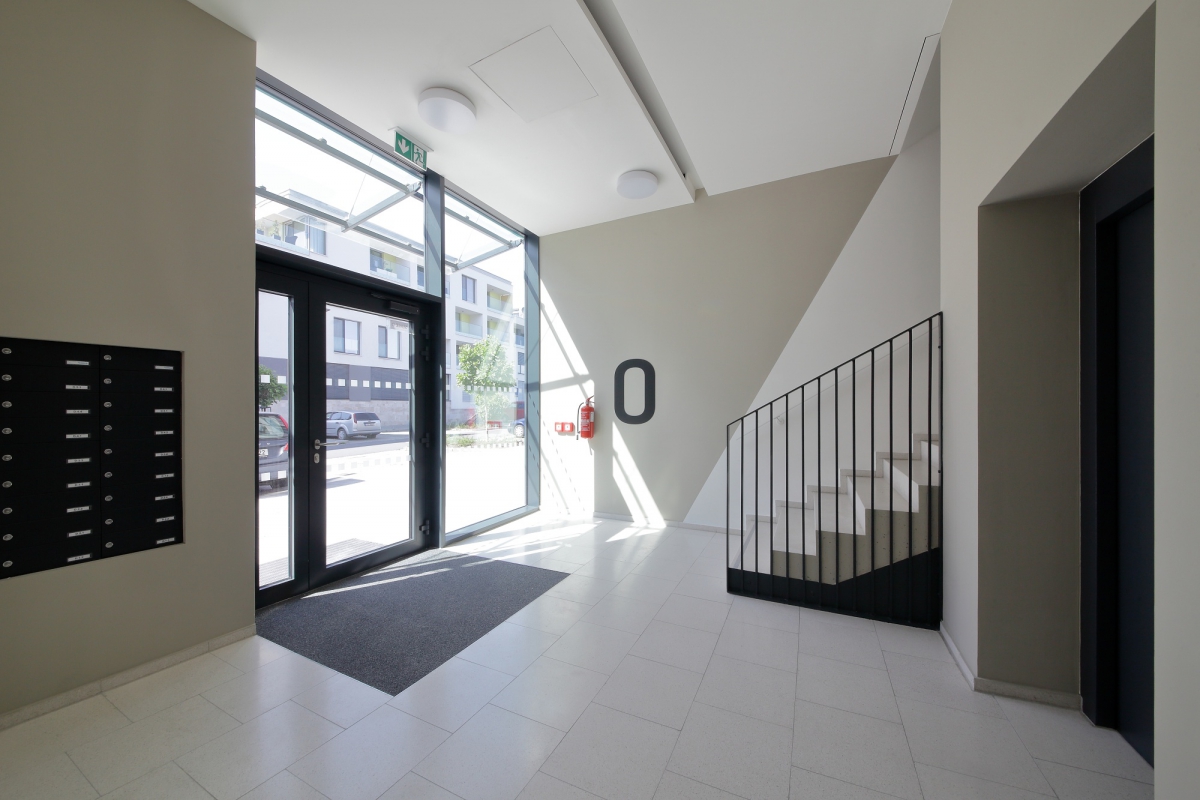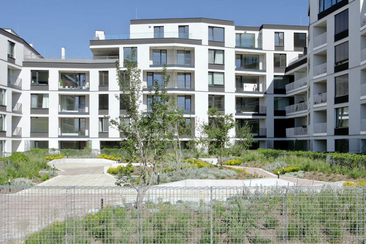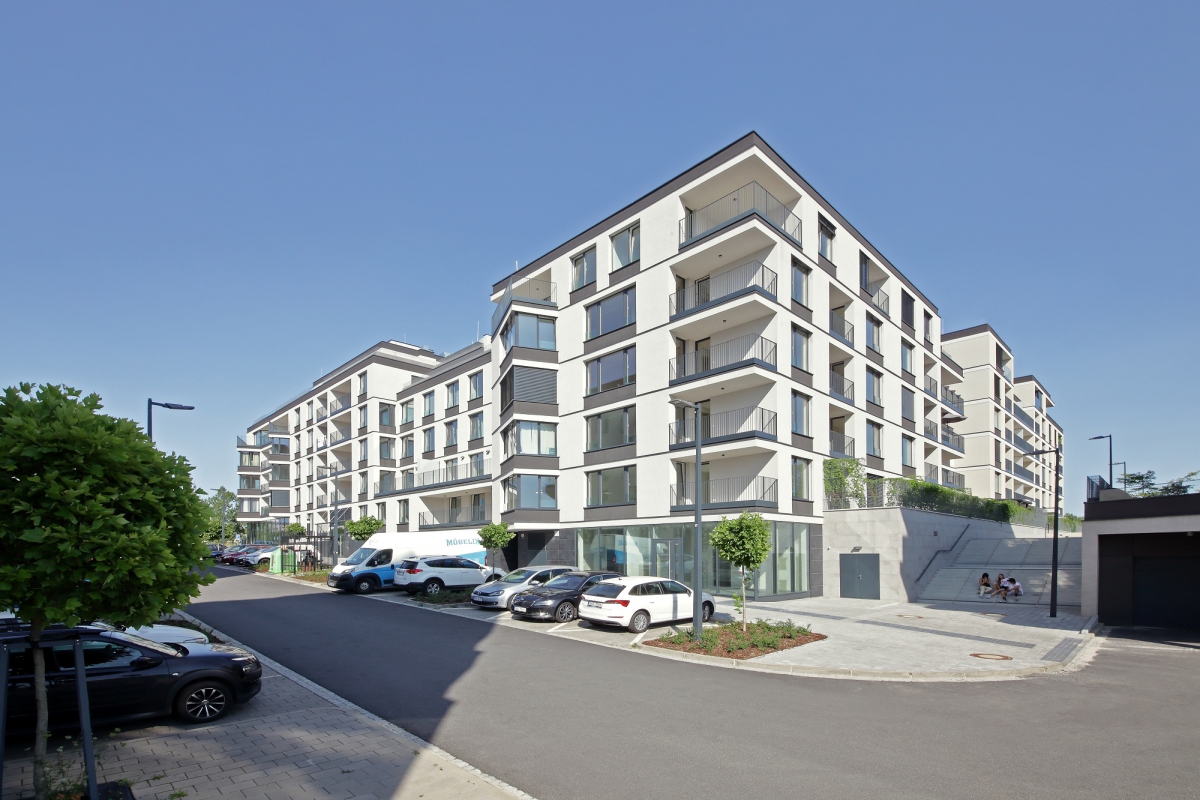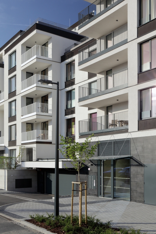 The volume of apartment building A1 is making a semi-closed part of the block which will be supplemented in the next phases of construction. The study is also working with height limits and dividing objects into smaller parts. This method helps to achieve the scale of a city street. The racial character of the street is changed in the courtyard with an organic form of angled facades. The silhouette of the A1 building is height divided by receding upper floors.