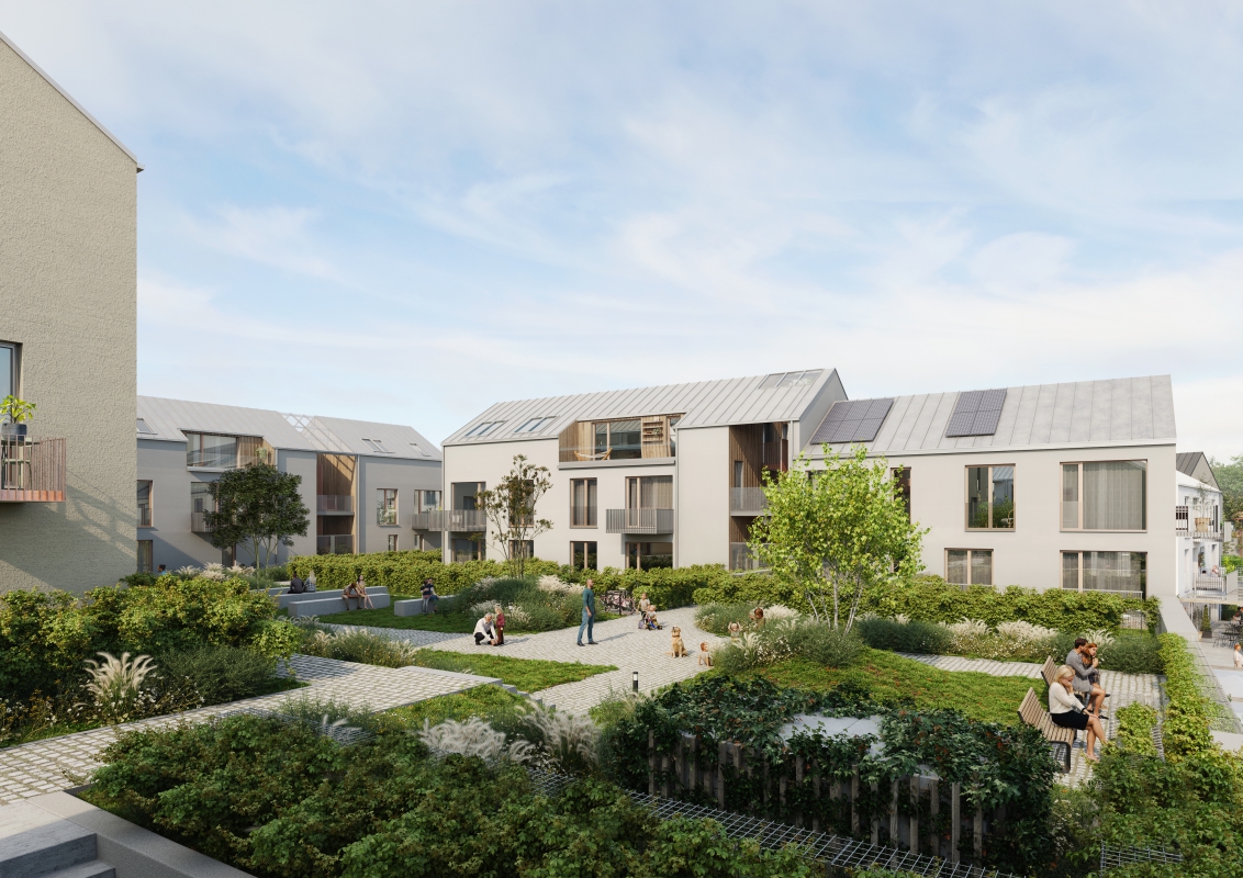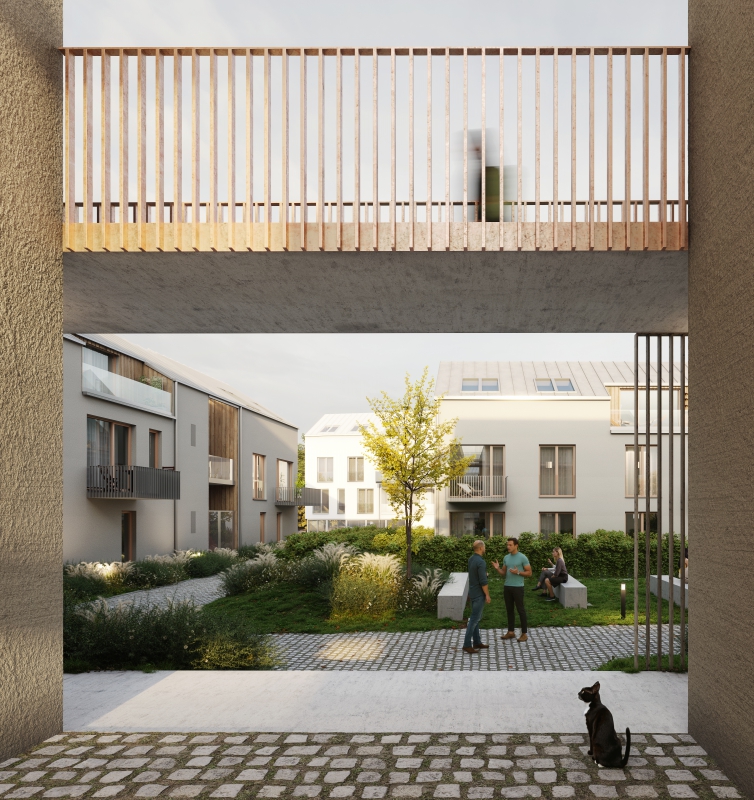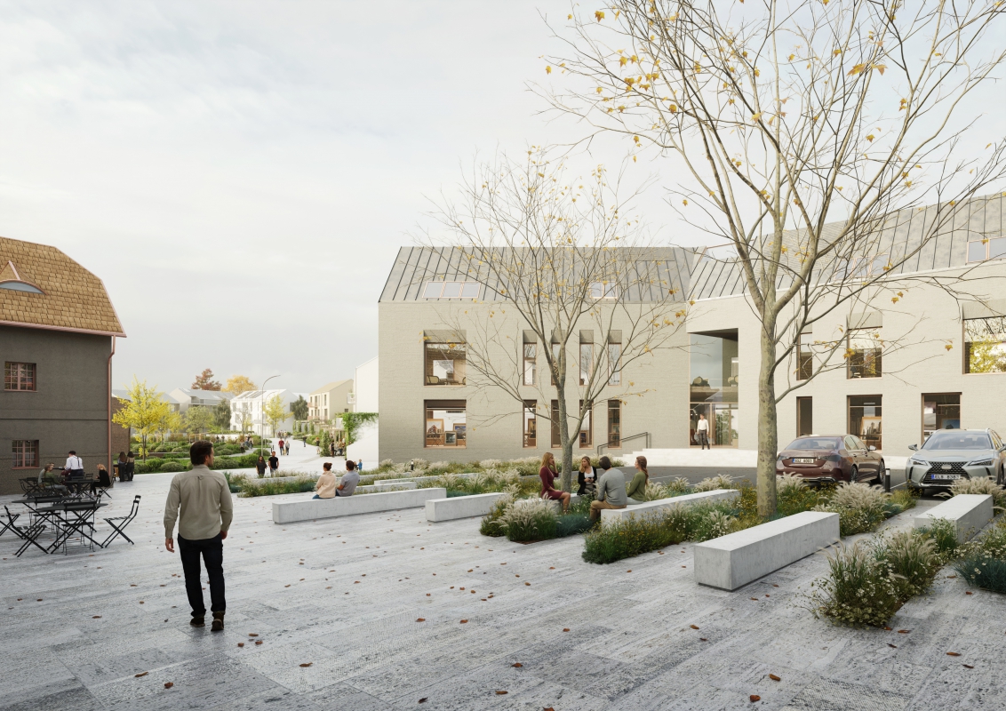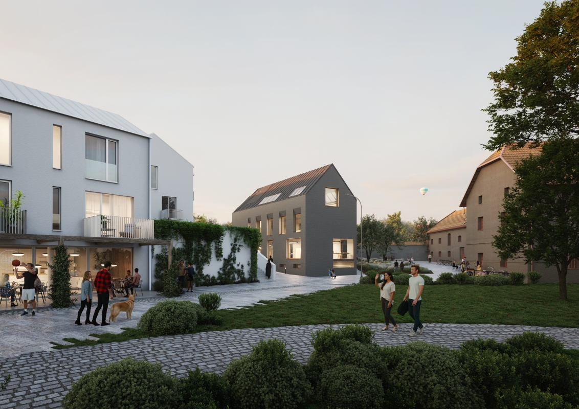 In 2020, we won an invited competition to design a new village centre with residential development. Since Polom already has its own historic centre - the newly renovated village square with adjacent amenities, we were looking for a way to embrace the site and bring new qualities to the village.