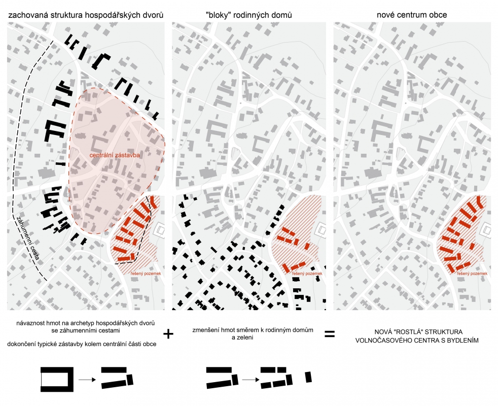The basic consideration of our proposal is the functional connection of these two centres and defining their character - a functional village with civic amenities and a newly emerging space offering housing, amenities and recreation. Their character is distinct and yet complementary to each other and form a whole.