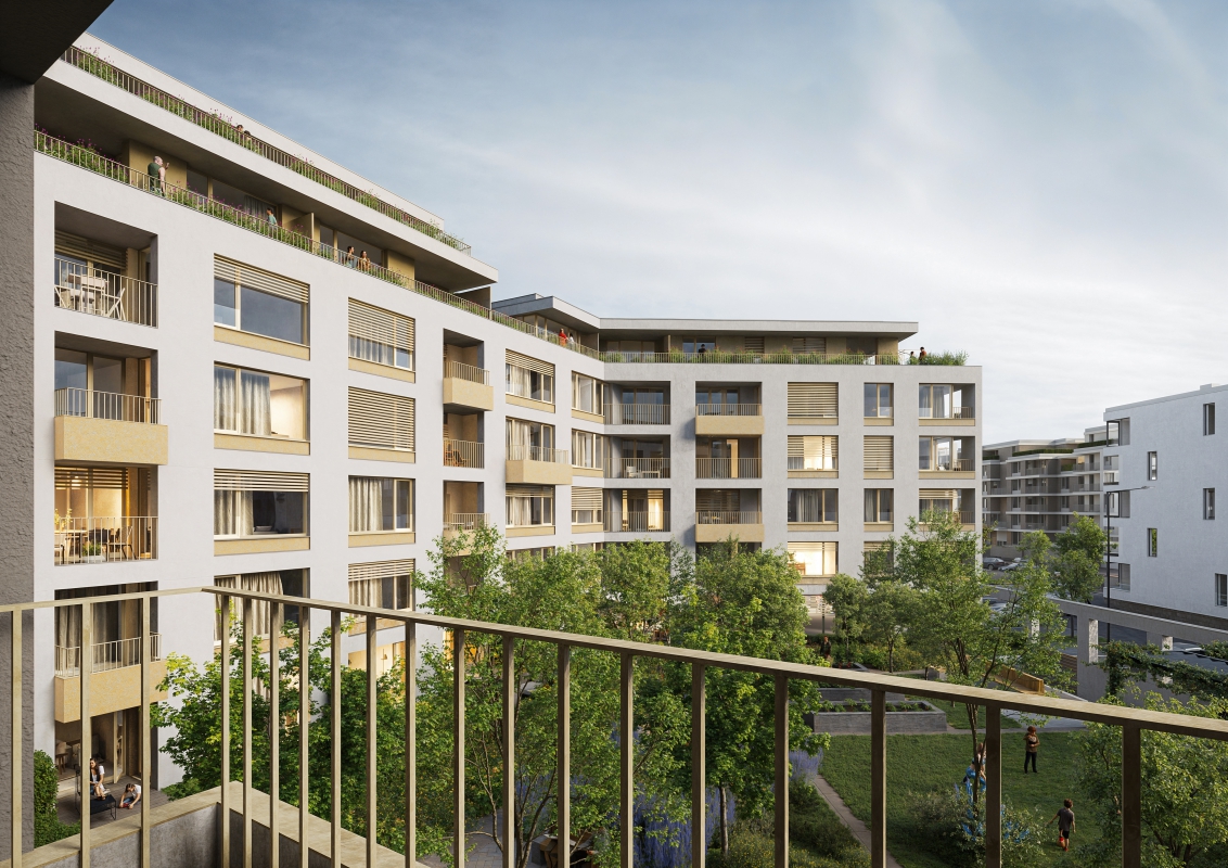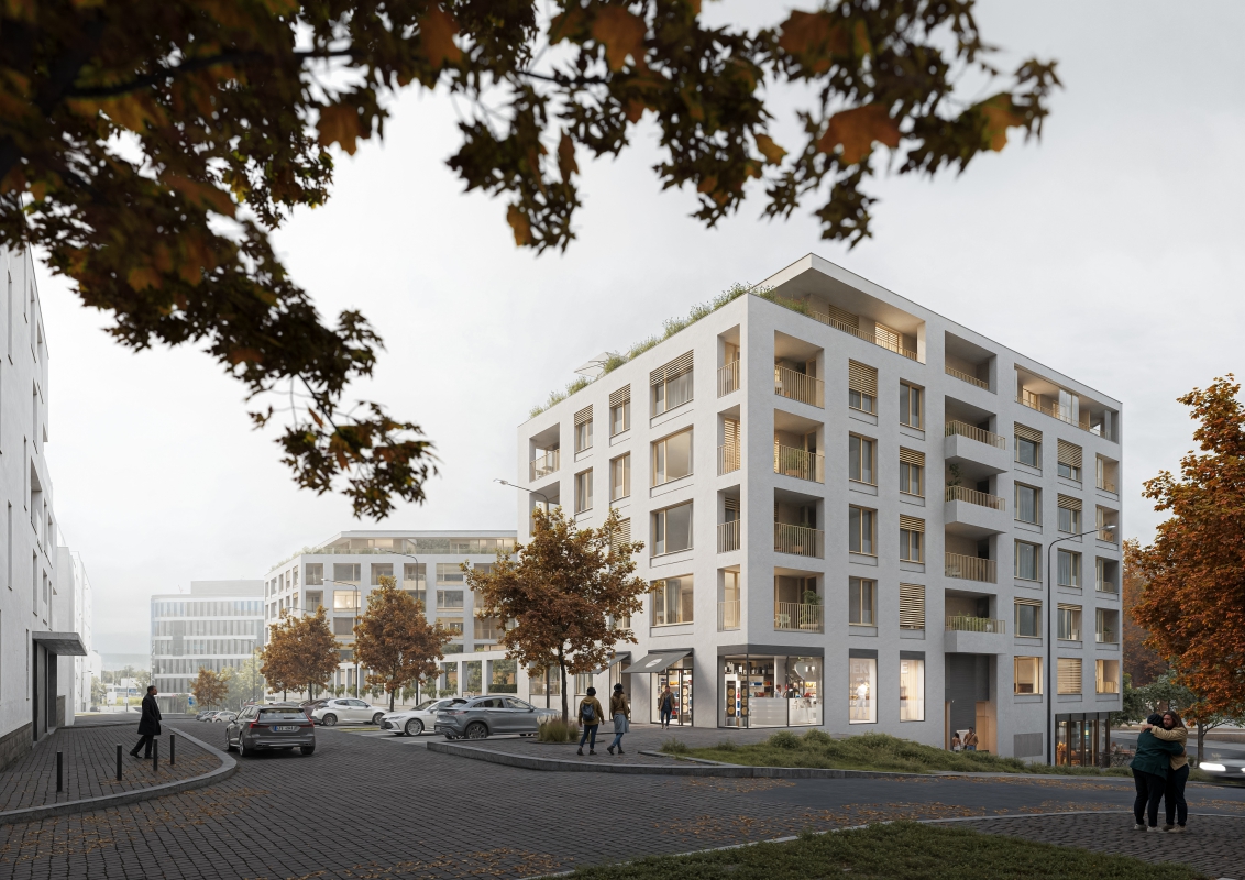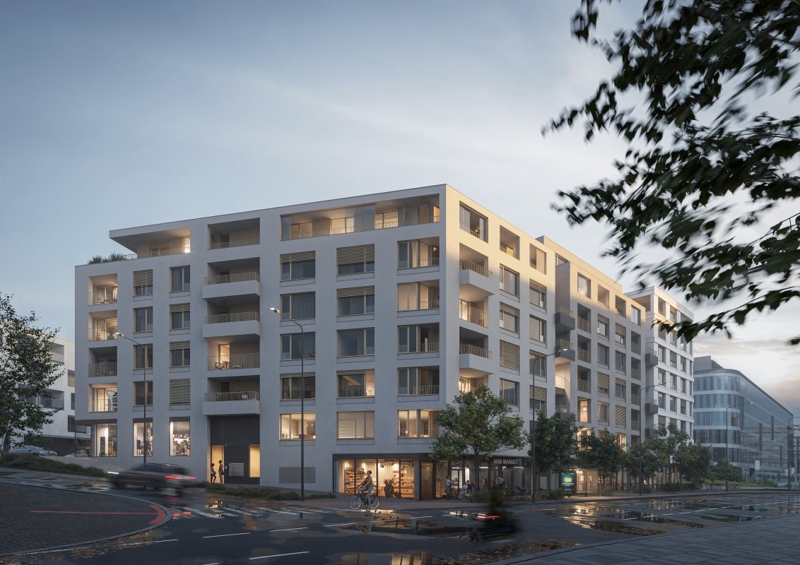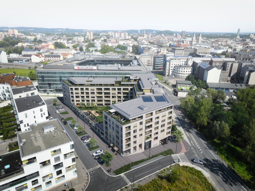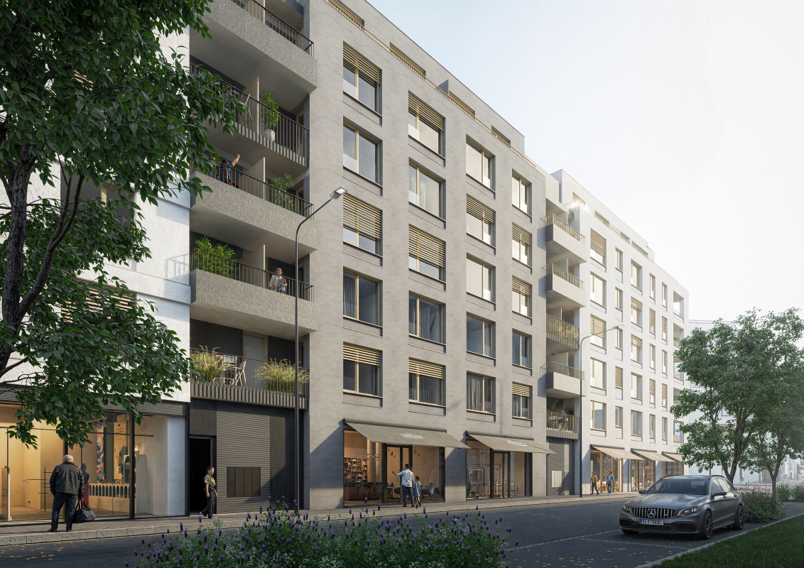 Residential Building C represents the continued phased development of Nová Karolina in Ostrava. The zoning study envisions this part of the city as a block of 5–7 storey buildings with a clearly defined street network. Block C takes the shape of an irregular trapezoid, following the historical structure of the city center. The articulation of the street facades evokes the appearance of tenement buildings, aligning the design more closely with the classic character and scale of the neighborhood.