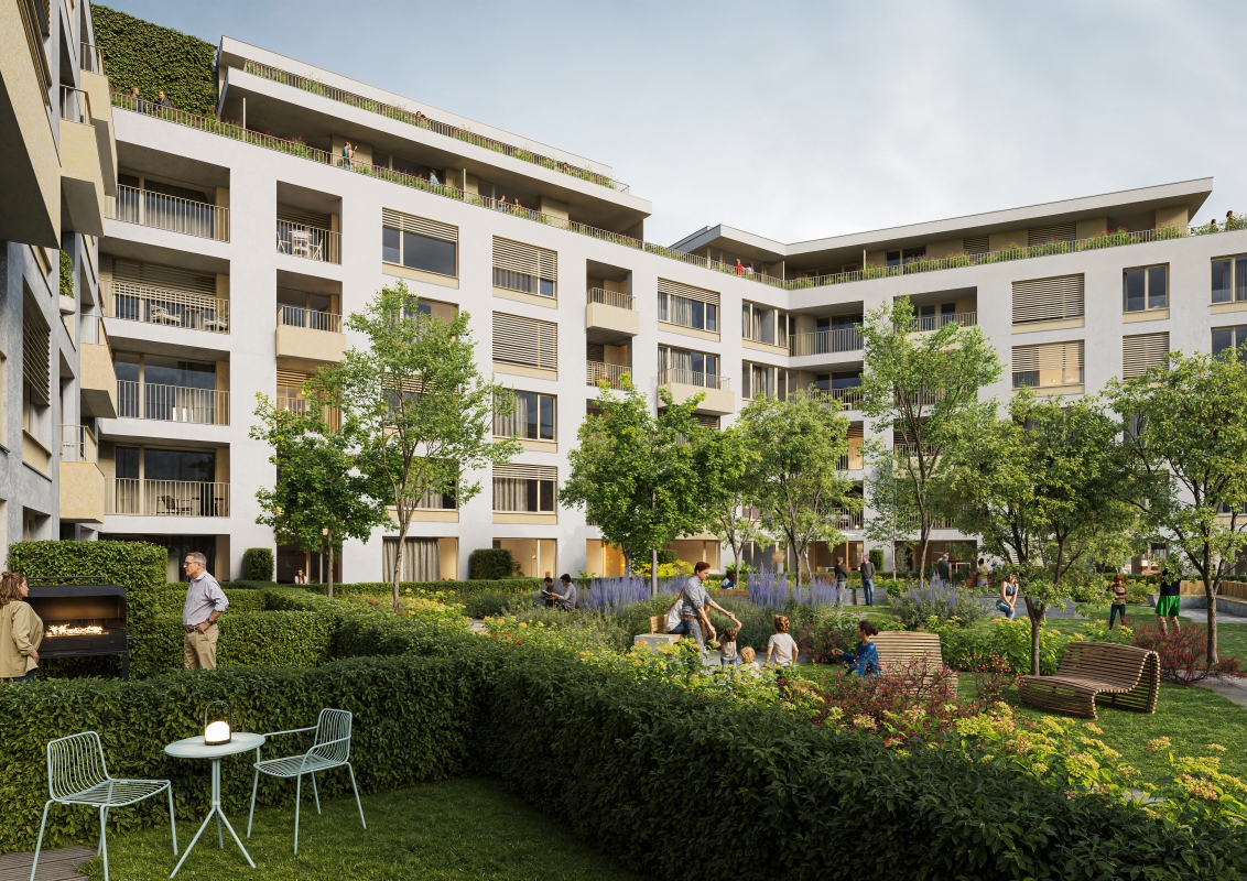 In contrast to the formal street facades, the courtyard space presents a more playful and inviting atmosphere, featuring communal living gardens and private front gardens for individual flats.