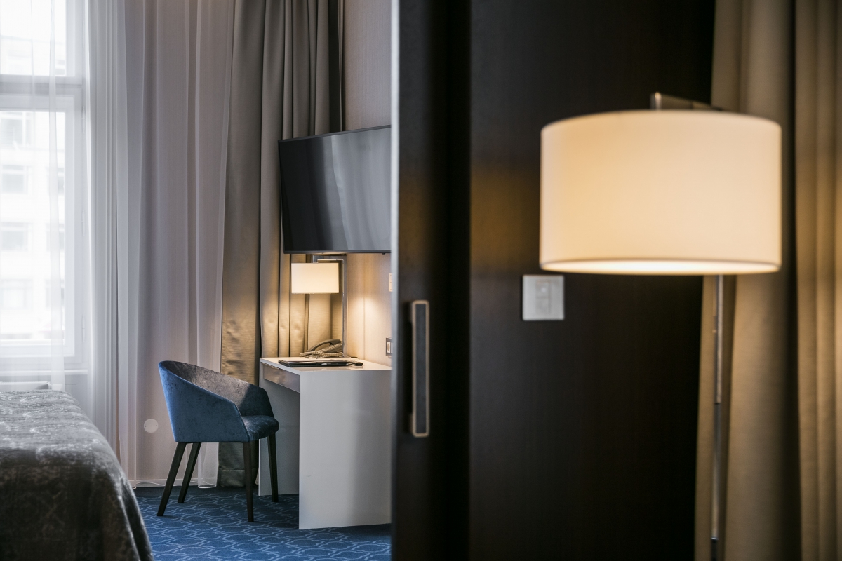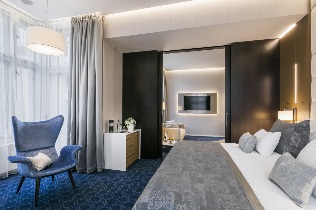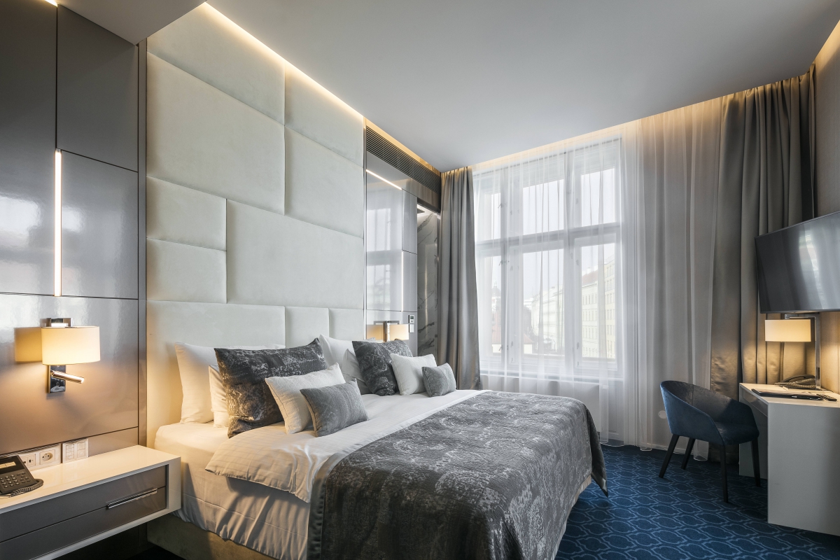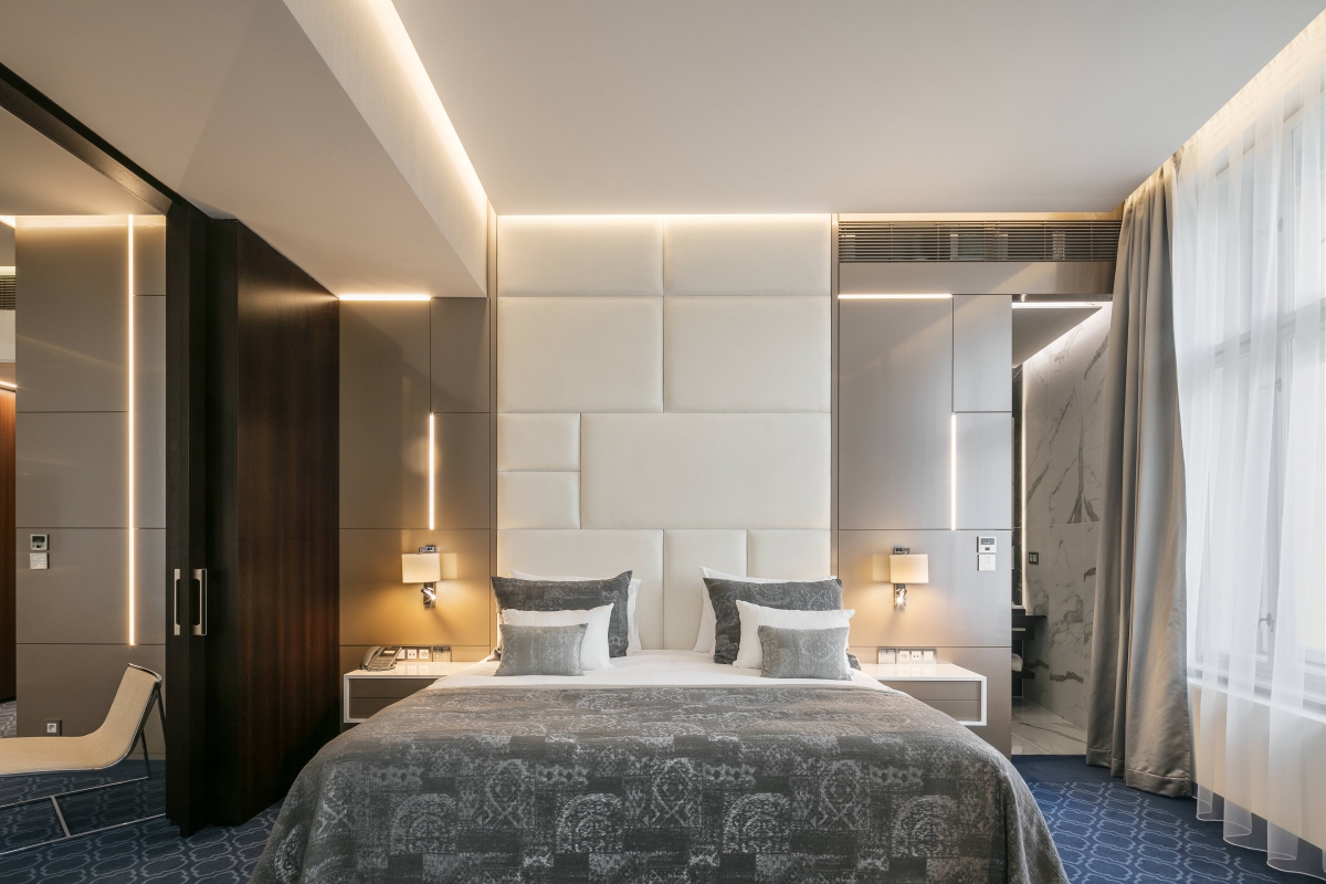 Around the perimeter of the rooms are installed diffused indirect lighting embedded in the negative join. The night atmosphere is made by classic hotel lamps supplemented by linear LED stripes integrated into the geometrically divided wall.