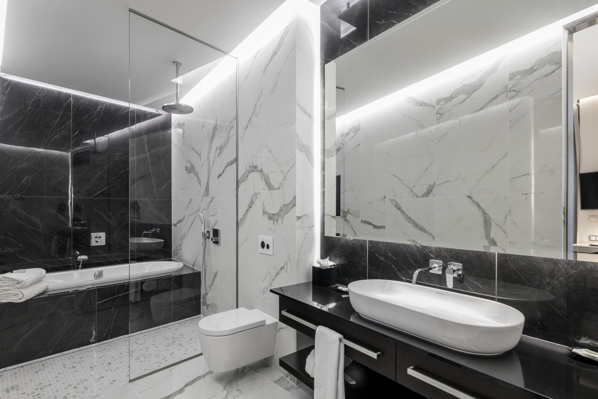 In bathrooms, you can find ceramic large format tiling in two contrasting colors of marble.