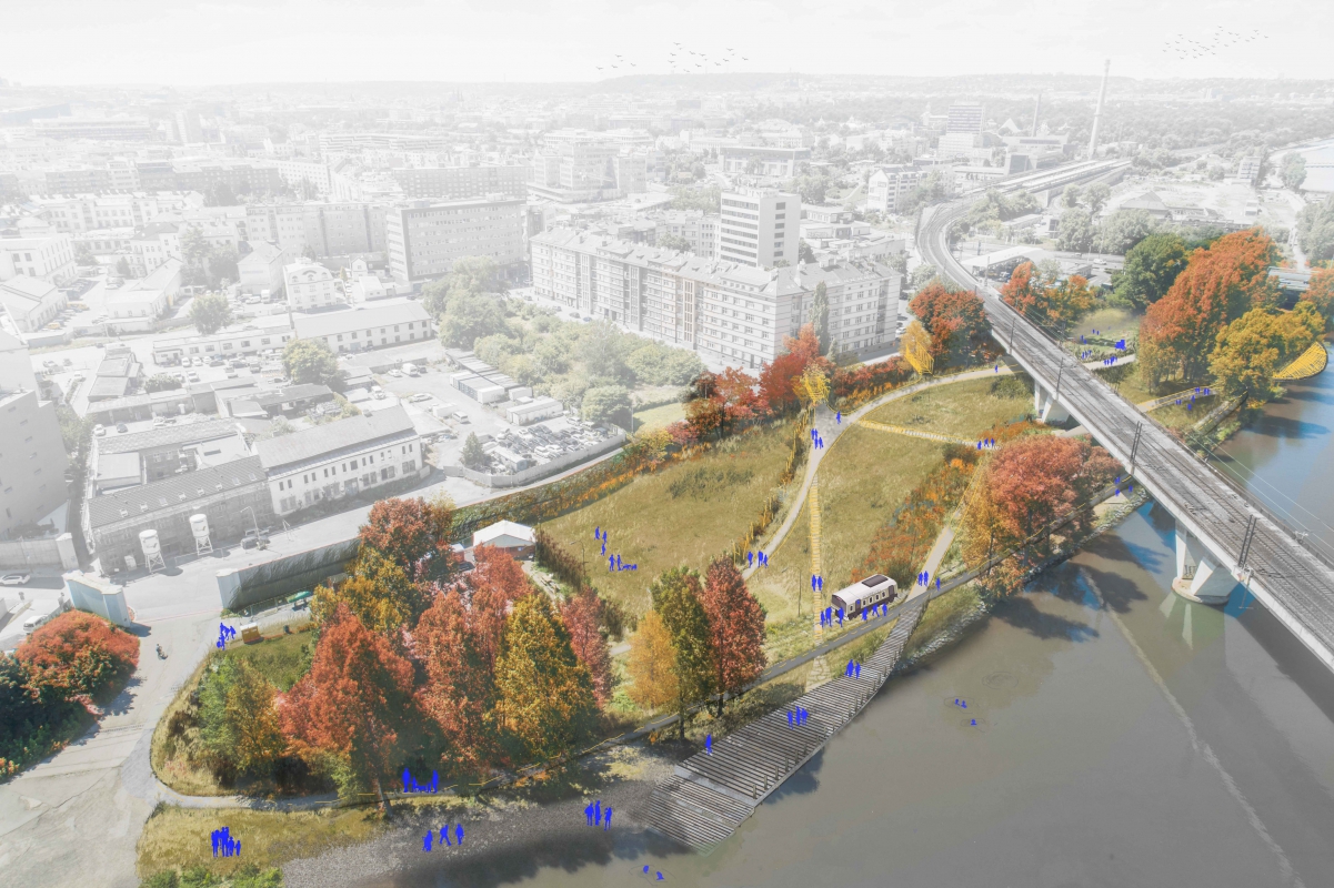 The project focuses on the use of the natural bank of the river, on its original purpose, to be used by visitors, not only in a narrow strip along the edge. The effort was to use the river bank in the entire depth of the area, to expand and supplement new activities interesting for local residents. Design long, promenade routes and transverse, short connections leading to significant activities concentrated on the river bank.