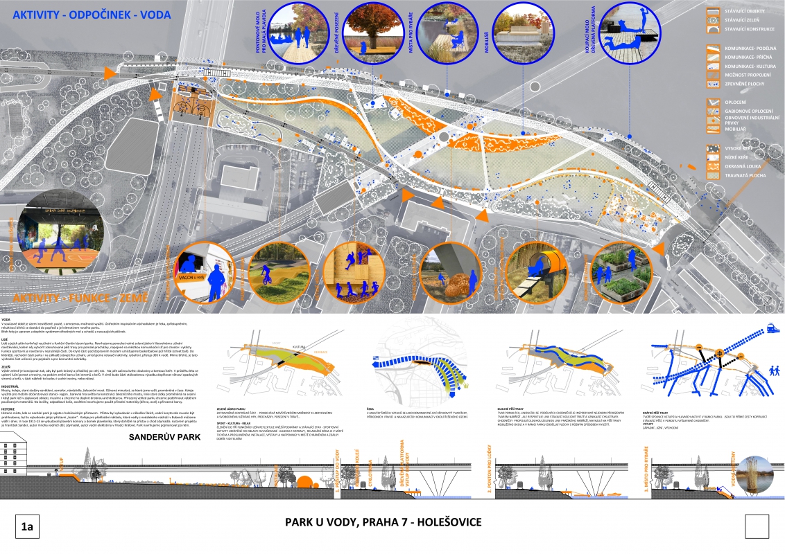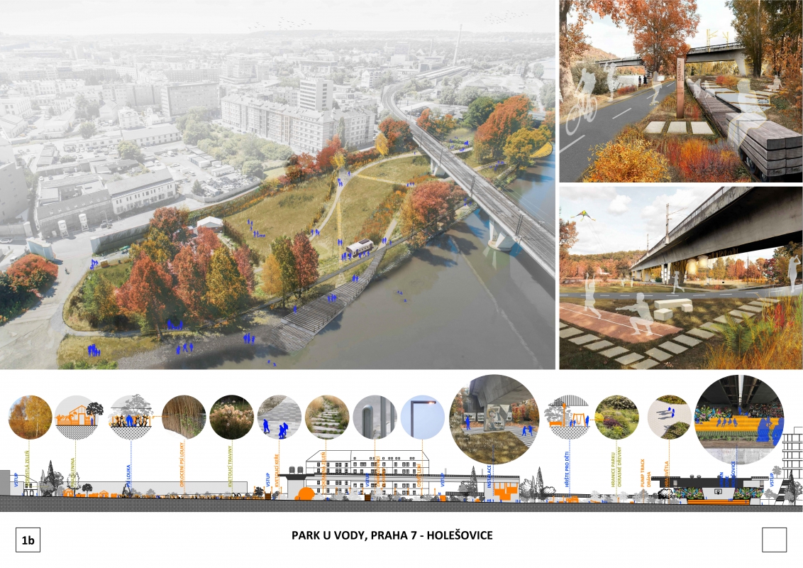 People and their diverse wishes. Is it possible to satisfy everyone? Functionally, we divide the park. We leave a green meadow, the green core of the park for any use. We set aside a place for dogs. Old vegetable species, community gardens, dispositionally combed, left in the administration of enthusiasts. Circular hiking trails for slow walks, complemented by straight trails to interesting places. Open barrier-free entrances for mothers with prams, people in wheelchairs, children on bikes. Renewed staircase, entrance between mature trees in the axis of U Vody street, connection to the city network, nearby kindergarten. Technical entrance for launching of ships in the eastern part, new connection to new construction in the western part.