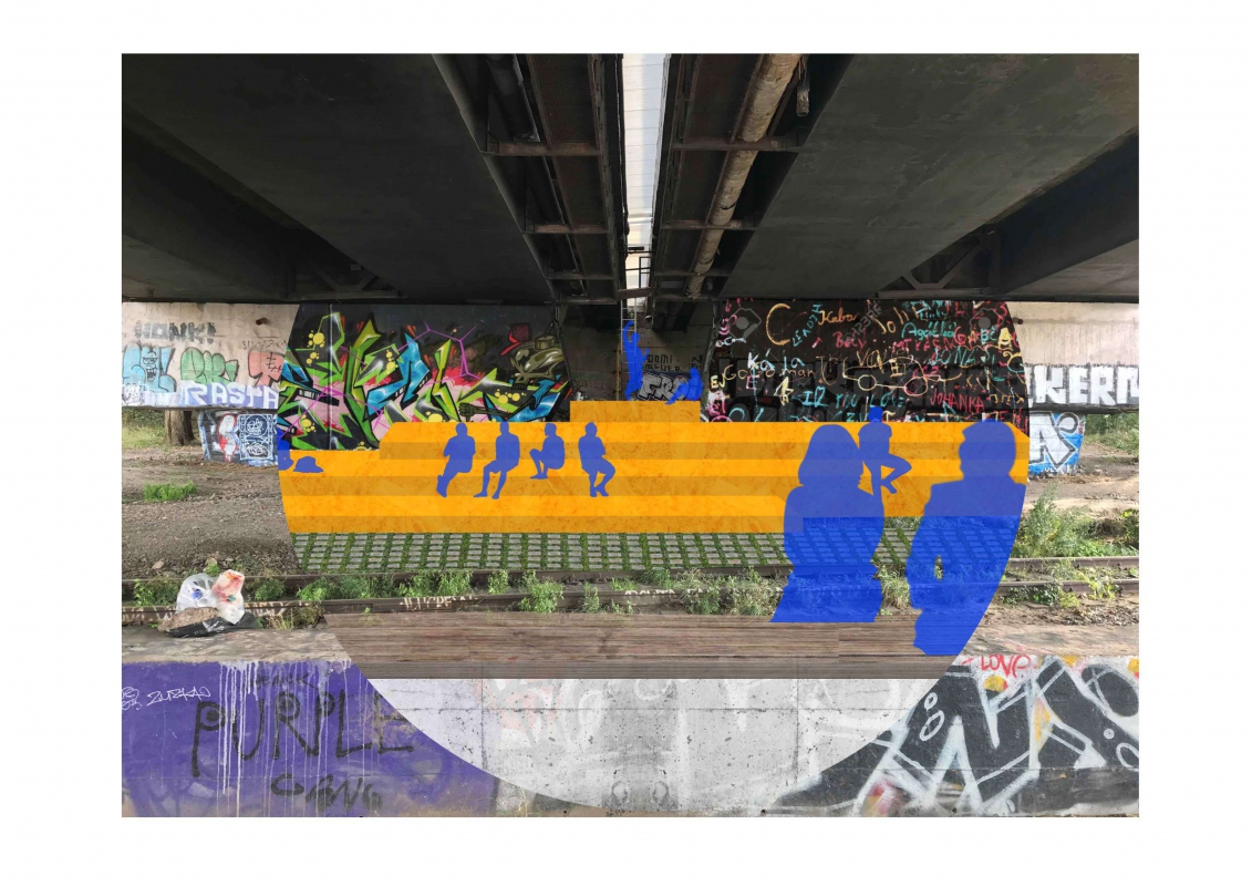 INDUSTRIALBridges, tracks, old lighting poles, traffic lights, railway bridge. The revived past we came from, transformed into time. Tracks used for a mobile refreshment station - a wagon, a colourful play of light on the construction of a railway bridge, the line of an old wall turned into a seating. Streetball and street art under the concrete sky. Modern lights, design benches and waste bins, steel bike stands, drinking fountains from the Czech manufacturer MMCITÉ. Construction of the port pier. Concrete pump track.