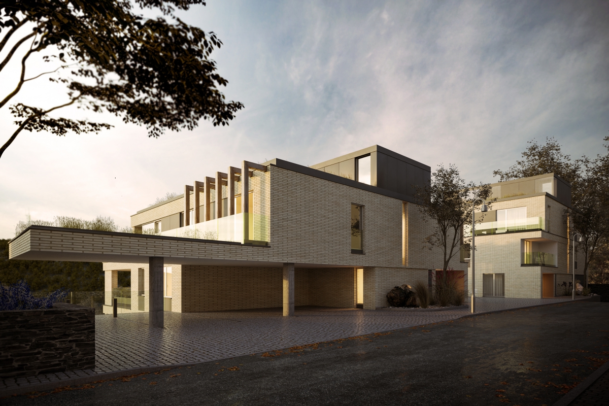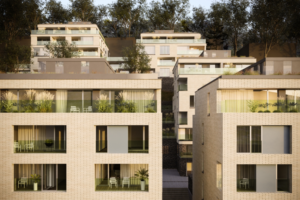 Architecturally, these are individual blocks, with an all-glass parterre, residential floors with facades of light brick cladding, open through French windows and bays of deep loggias. The facade is more open towards the park and towards the top of the slope. Sun protection is provided by external blinds. The top floor designed as “retreated”.