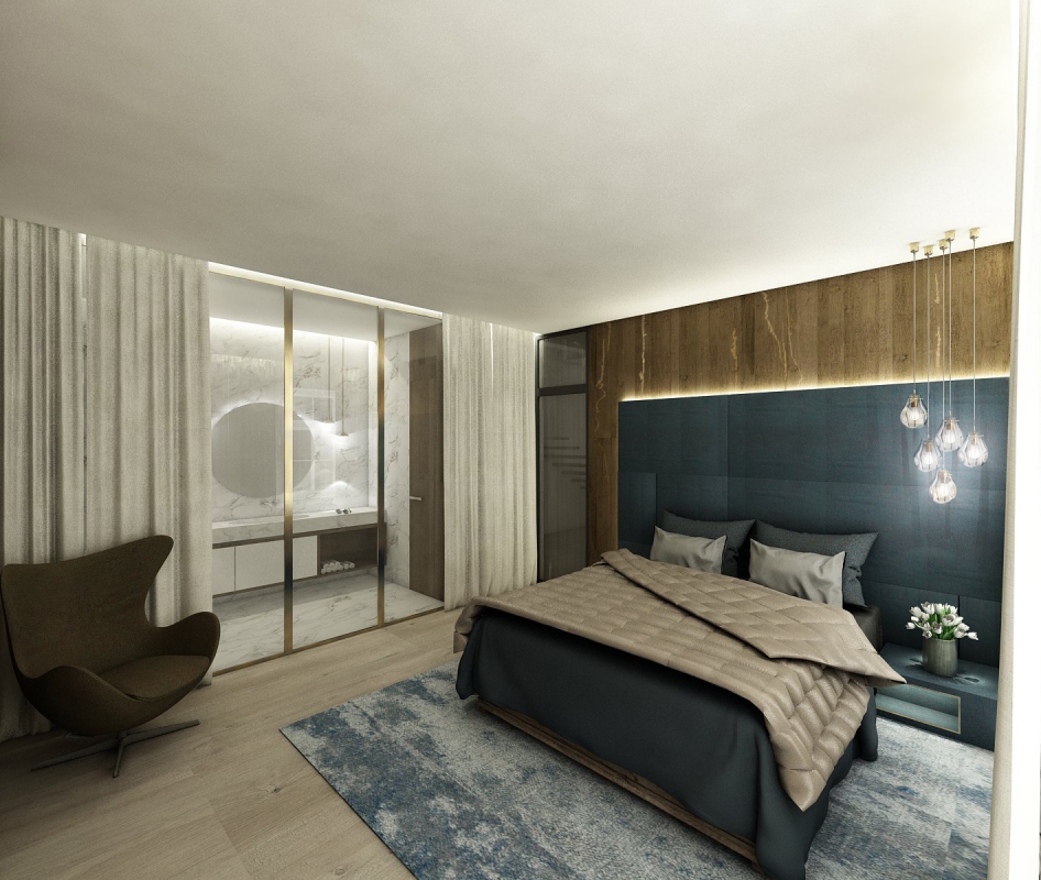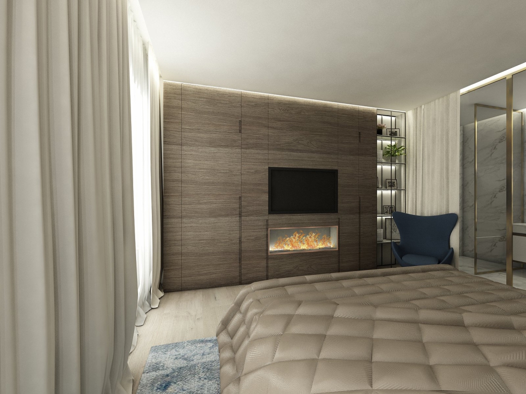 Both the parents' bedroom and the children's room have private bathrooms. The parents' room is complemented by a dressing room and a laundry room. The staircase connected to the 6th floor is intended for guests. This is a separate apartment with a bathroom and access to the terrace. When designing the interior, we followed the requirements of the investor, who preferred modern design and valuable, durable materials. The floor is uniform throughout the space of oak parquet in the Hungarian pattern. Rooms are decorated with wood paneling, and the bathrooms have large-format marble.