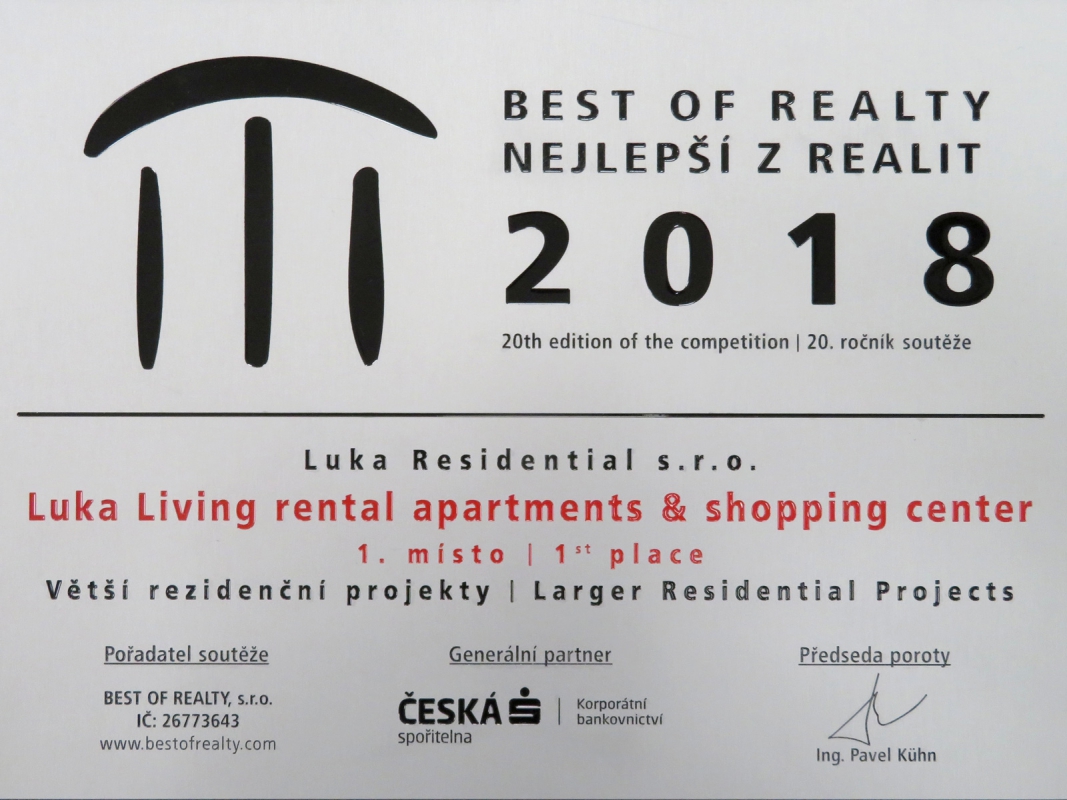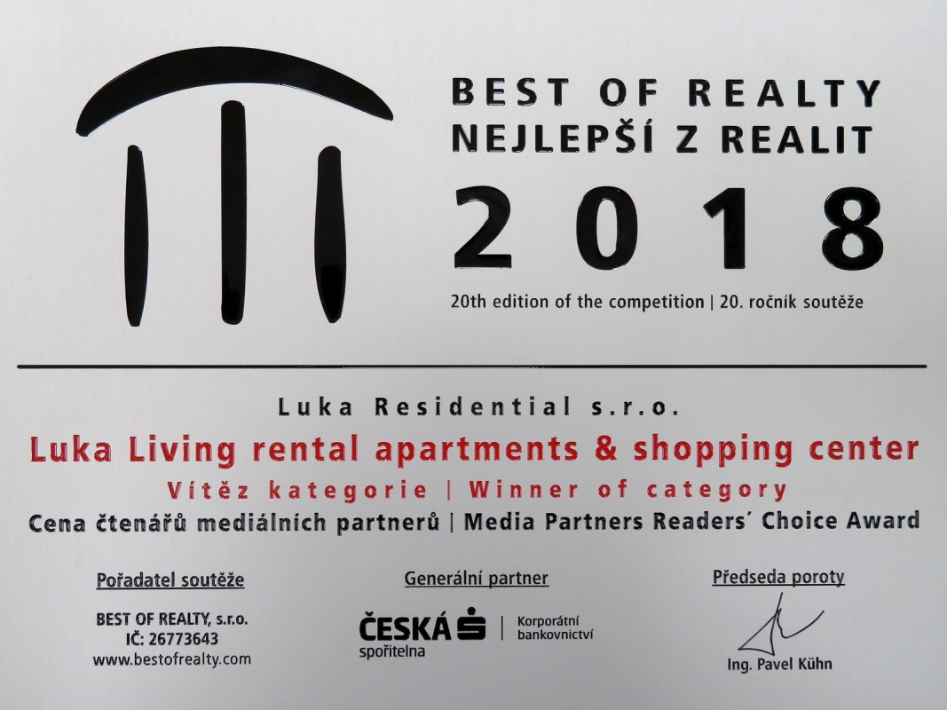 V prestižní soutěži „BEST OF REALTY - NEJLEPŠÍ Z REALIT“ 2018 Nájemní komplex Luka – Luka Living zvítězil v kategorii Větší rezidenční projekty a zároveň získal cenu čtenářů mediálních partnerů.