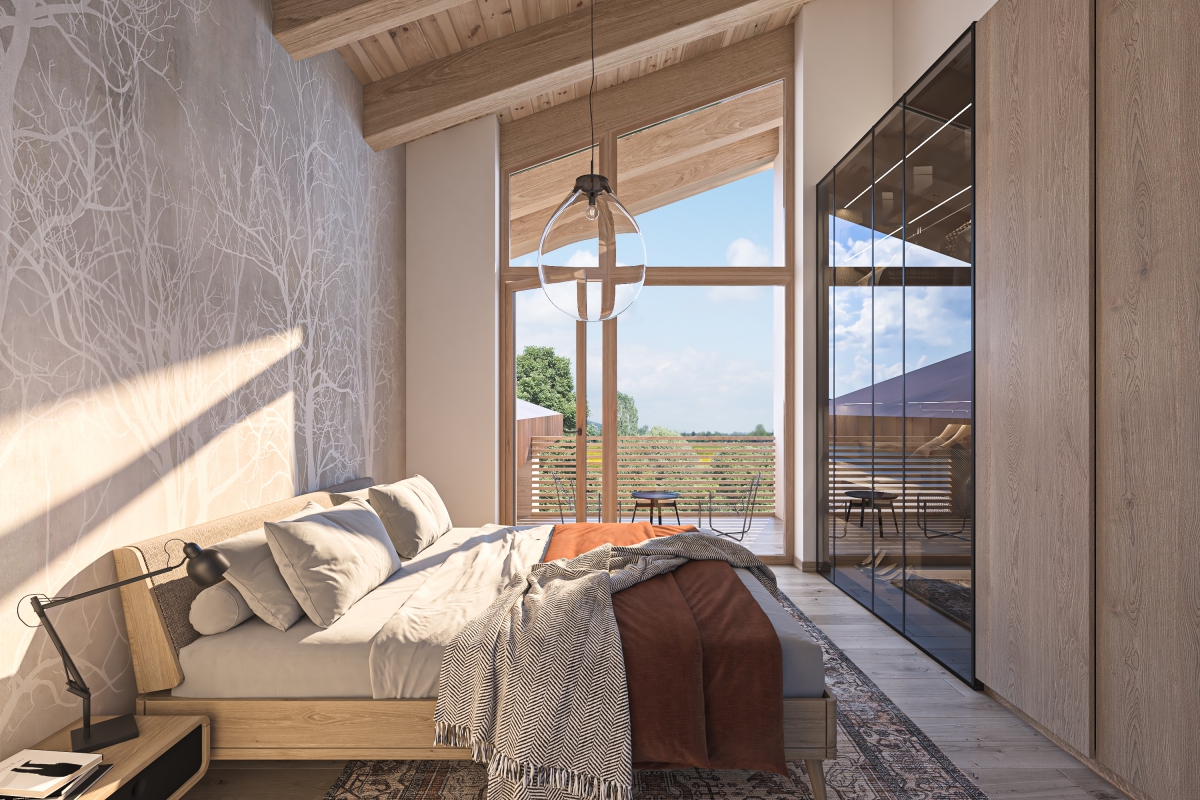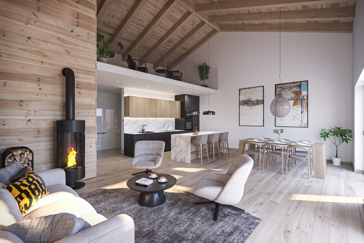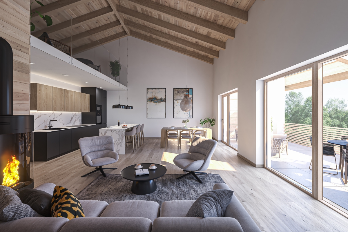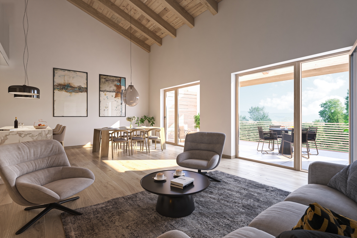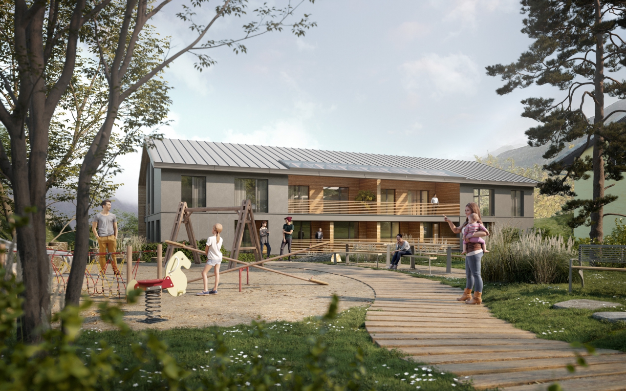 Résidence du Soleil se nachází na západním okraji obce. Svou podobou přímo reaguje na okolí - otevírá se směrem k nejkrásnějším výhledům. Severní terasy směřují k horským hřebenům, jižní terasy přivádí výhledy z údolí přímo do obývacích pokojů rezidentů. Archetypální hmota vycházející z podoby původních hospodářských objektů umožňuje využít svažitý terén na maximum a zároveň umístit až 28 bytových jednotek s podzemními garážemi, aniž by bytový dům narušoval alpskou scenerii.