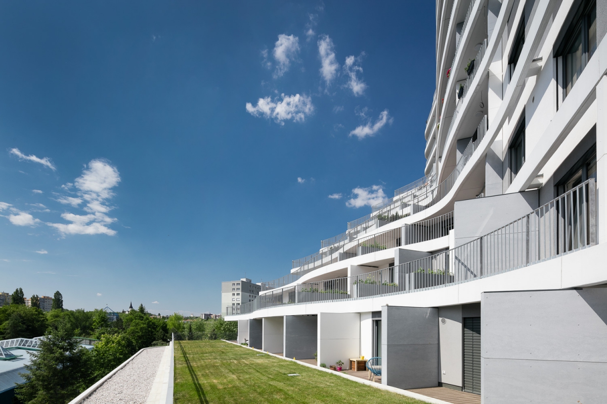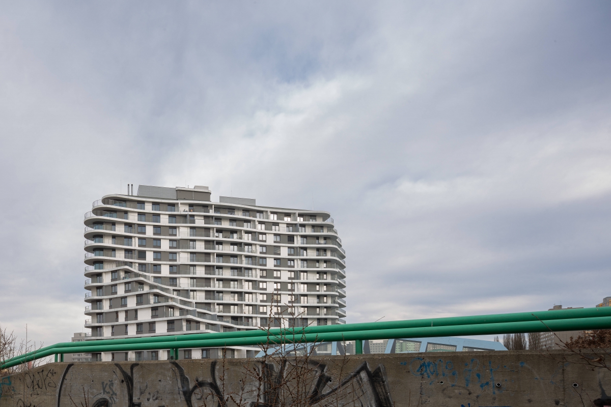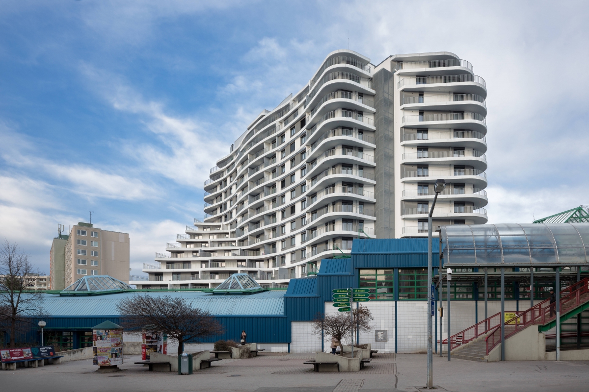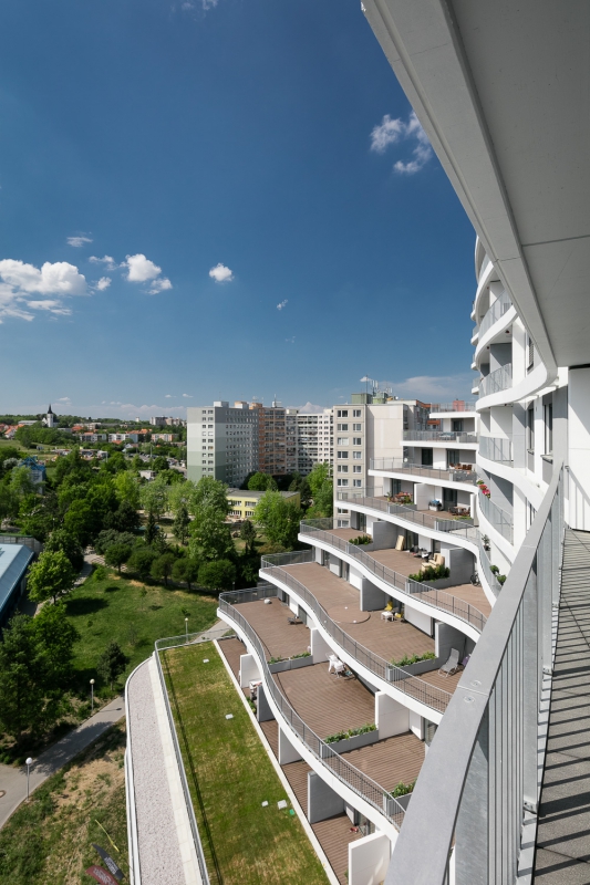 Byty nejsou určeny k přímému prodeji, ale k pronájmu. Hmota je organicky tvarována pomocí balkonů při zachování jednoduchého konstrukčního tvaru obvodových konstrukcí. Pravidelně strukturovaná fasáda a její tvar podporují celistvost designu. Patro s obchodní pasáží je plně prosklené, díky němuž se atraktivita podlaží prezentuje i navenek.