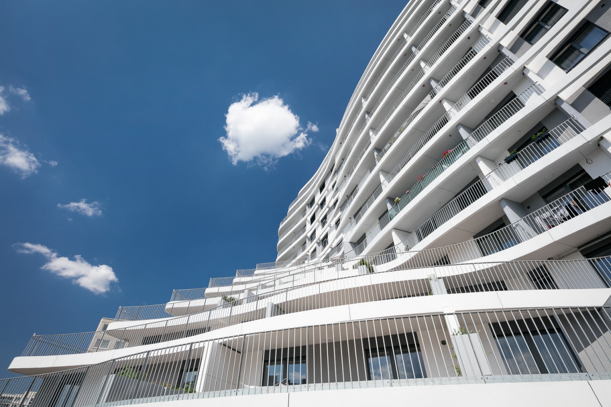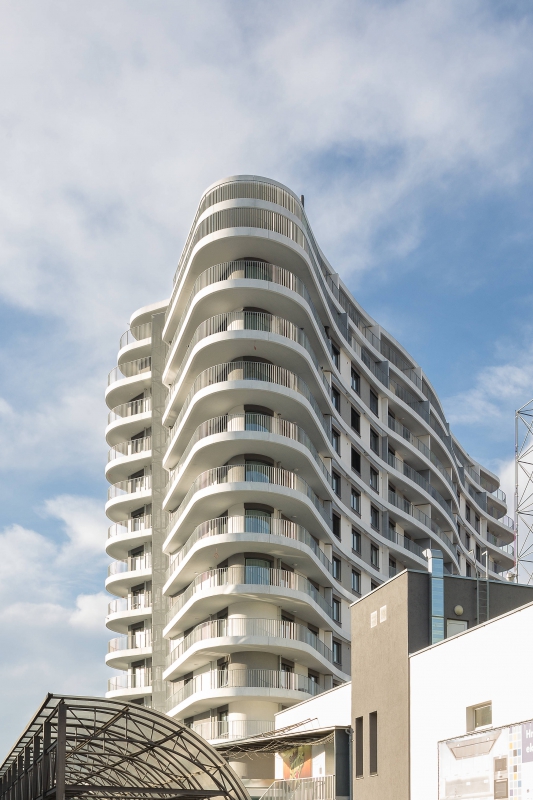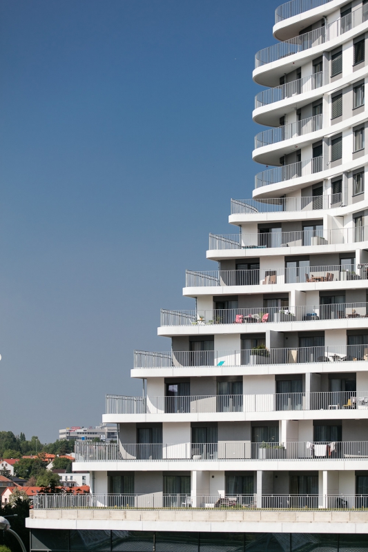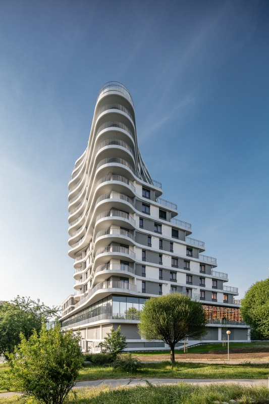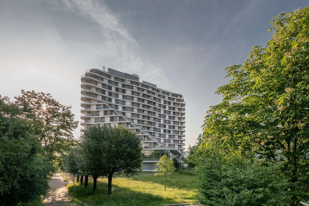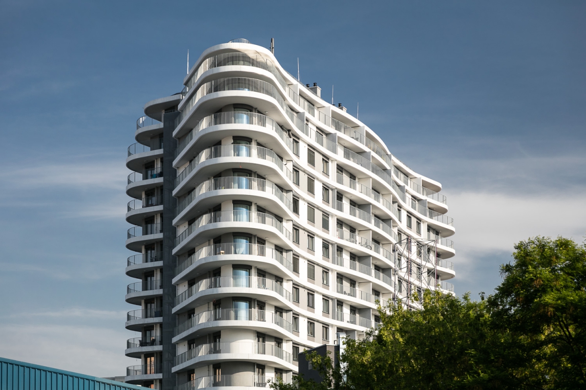 Byty nejsou určeny k přímému prodeji, ale k pronájmu. Hmota je organicky tvarována pomocí balkonů při zachování jednoduchého konstrukčního tvaru obvodových konstrukcí. Pravidelně strukturovaná fasáda a její tvar podporují celistvost designu. Patro s obchodní pasáží je plně prosklené, díky němuž se atraktivita podlaží prezentuje i navenek.